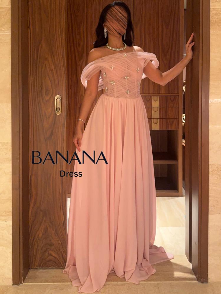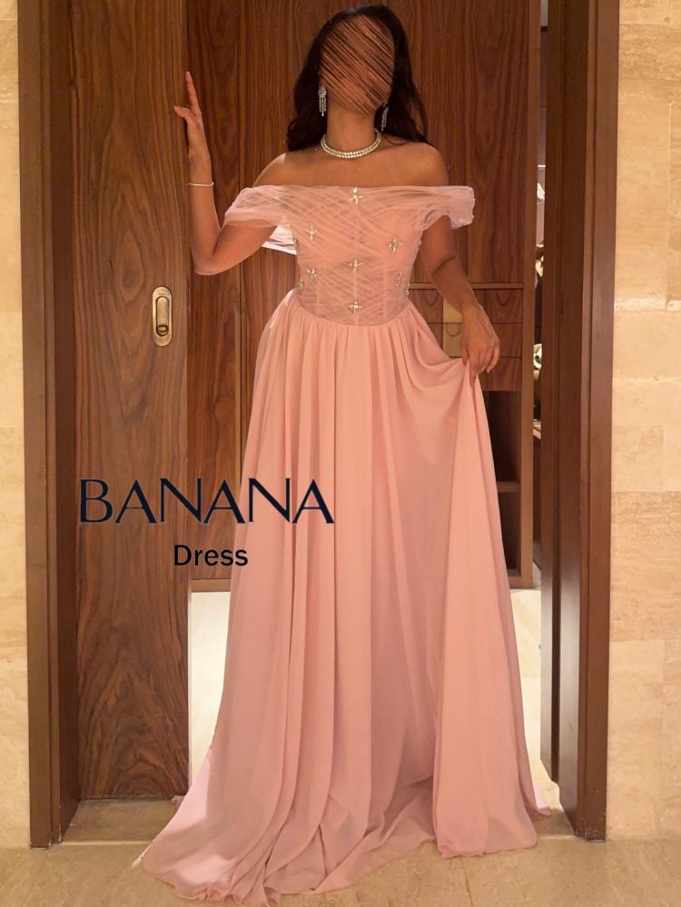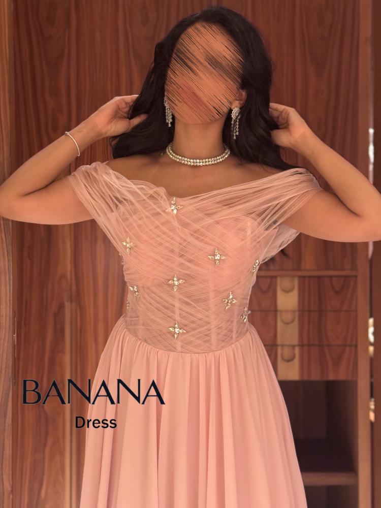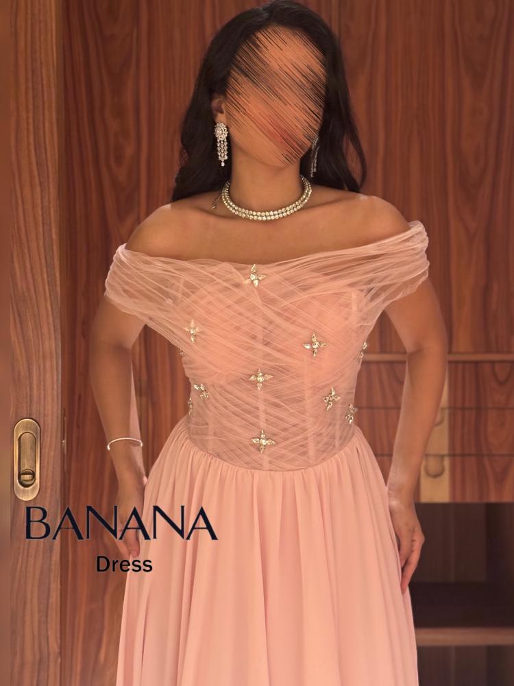 فستان سهرة وردي شيفون مطاعم بالفصوص