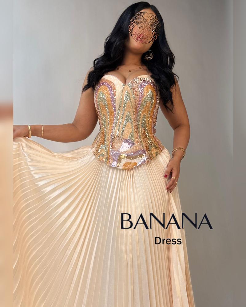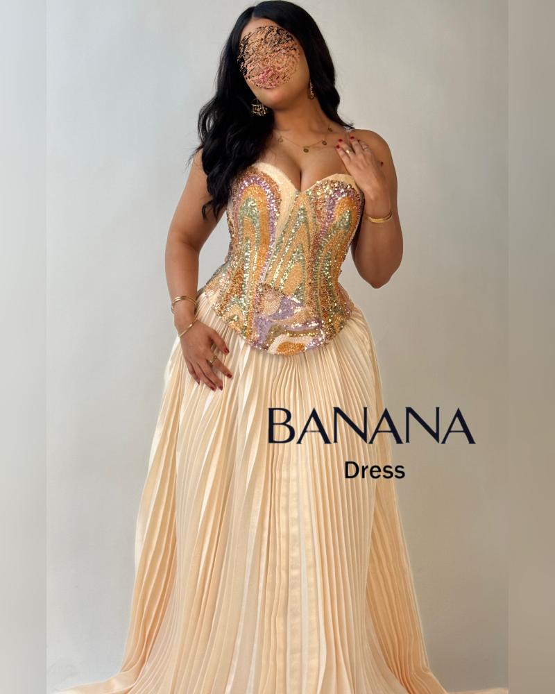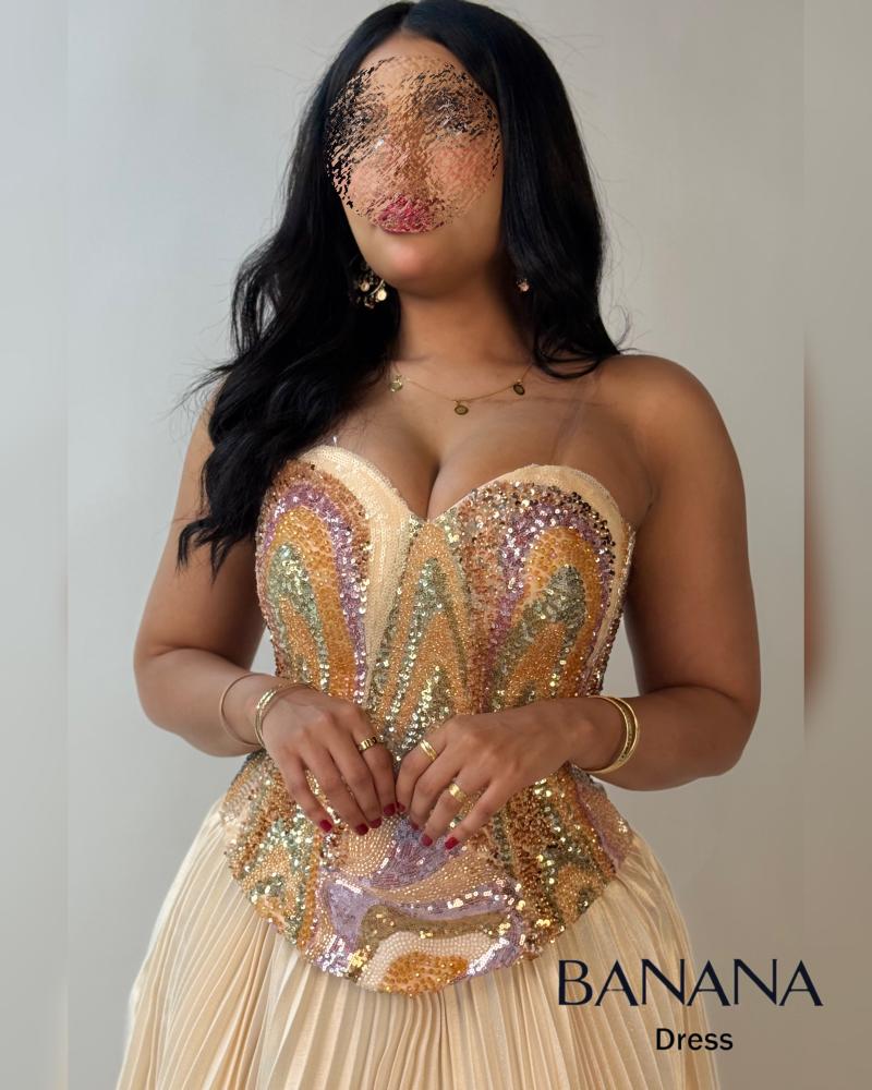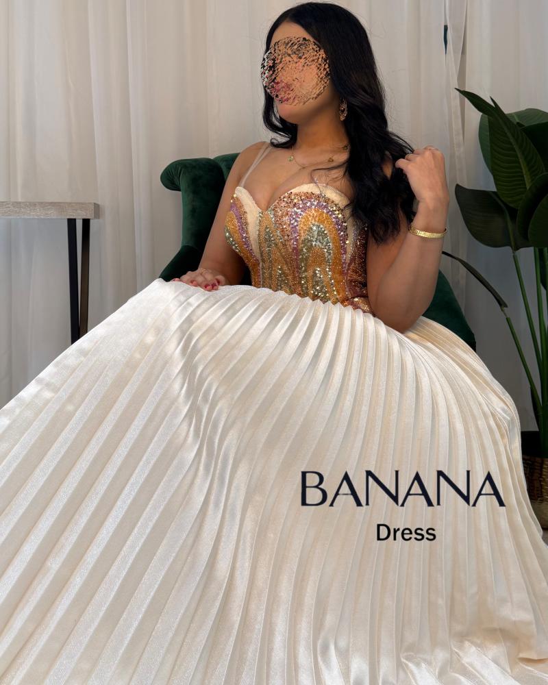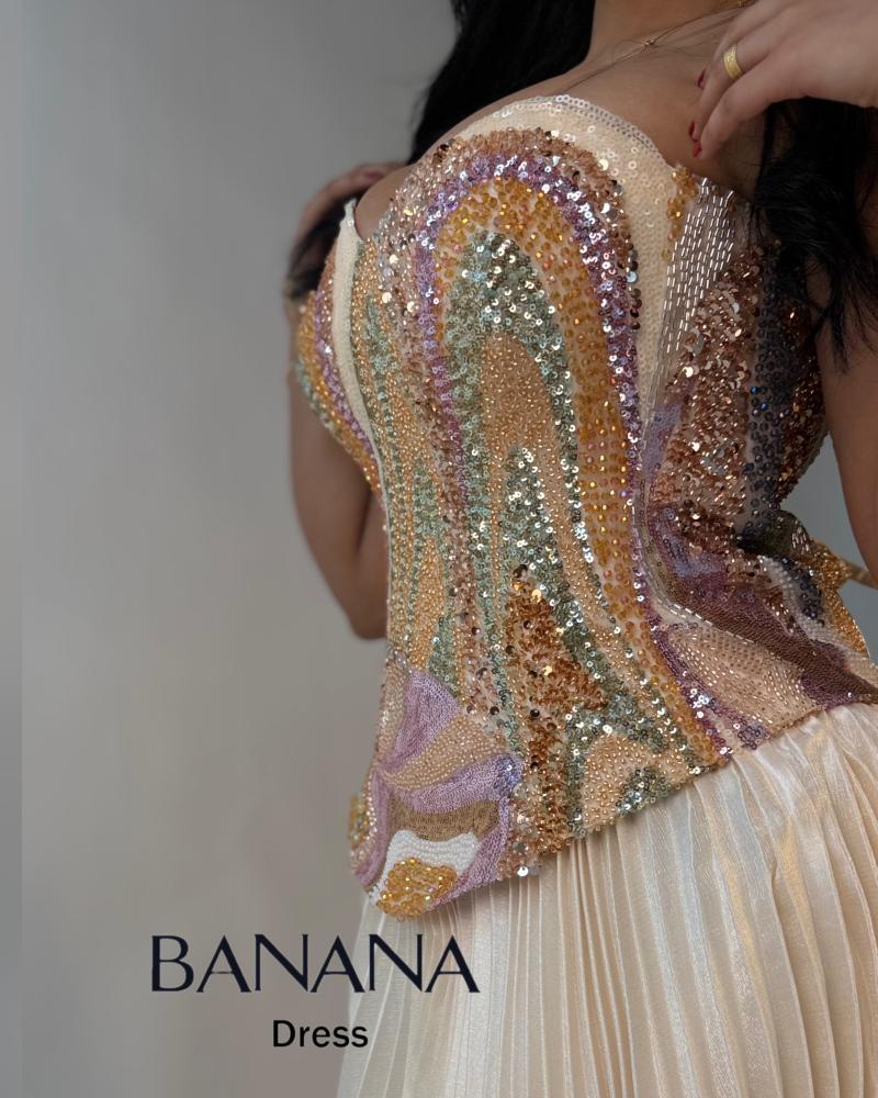 فستان سهره بيج فاتح مطعم بالتطريز الكامل من جه الصدر والكسرات في الاسفل