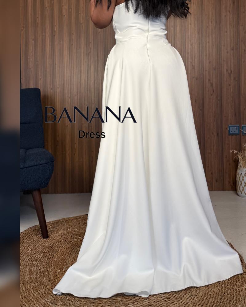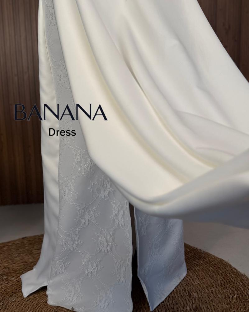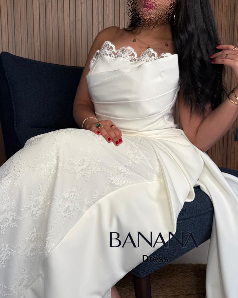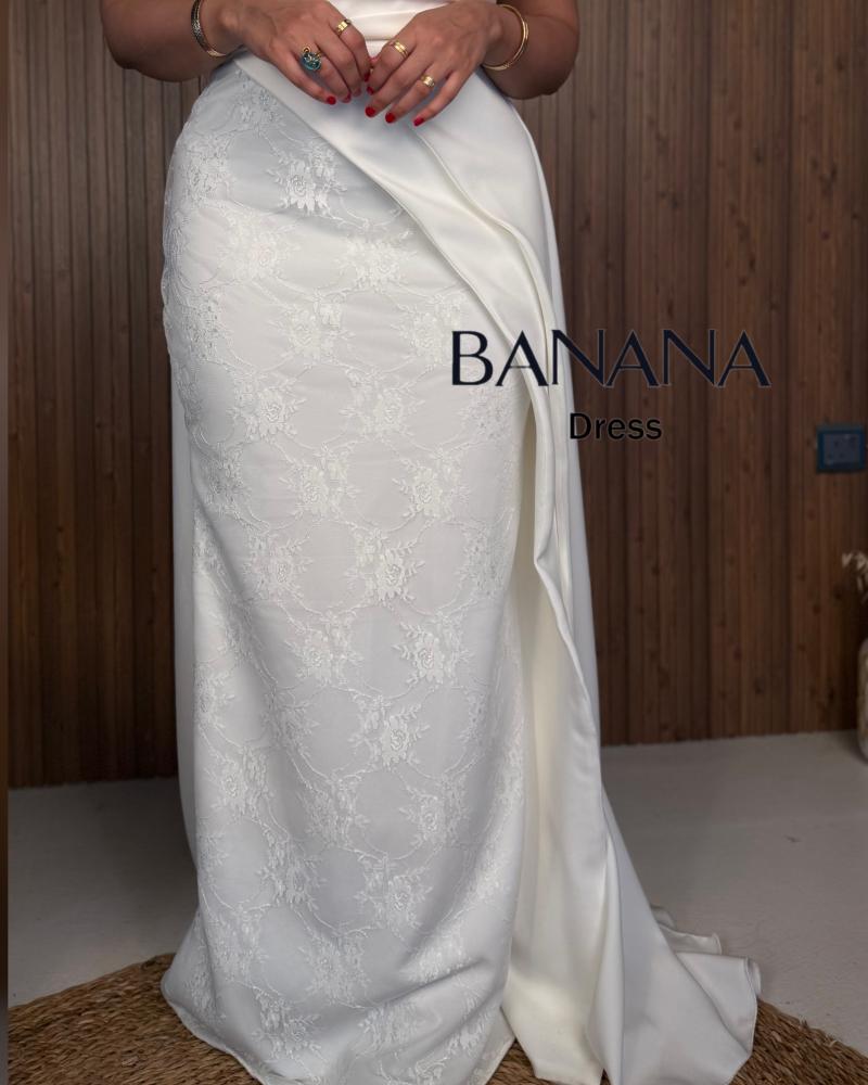 فستان ناعم ابيضّ مطعم من الصدر بالكلفة ومن الأرداف بالدانتيل ومن الخلف وشاح