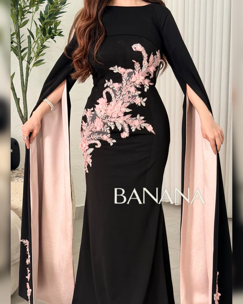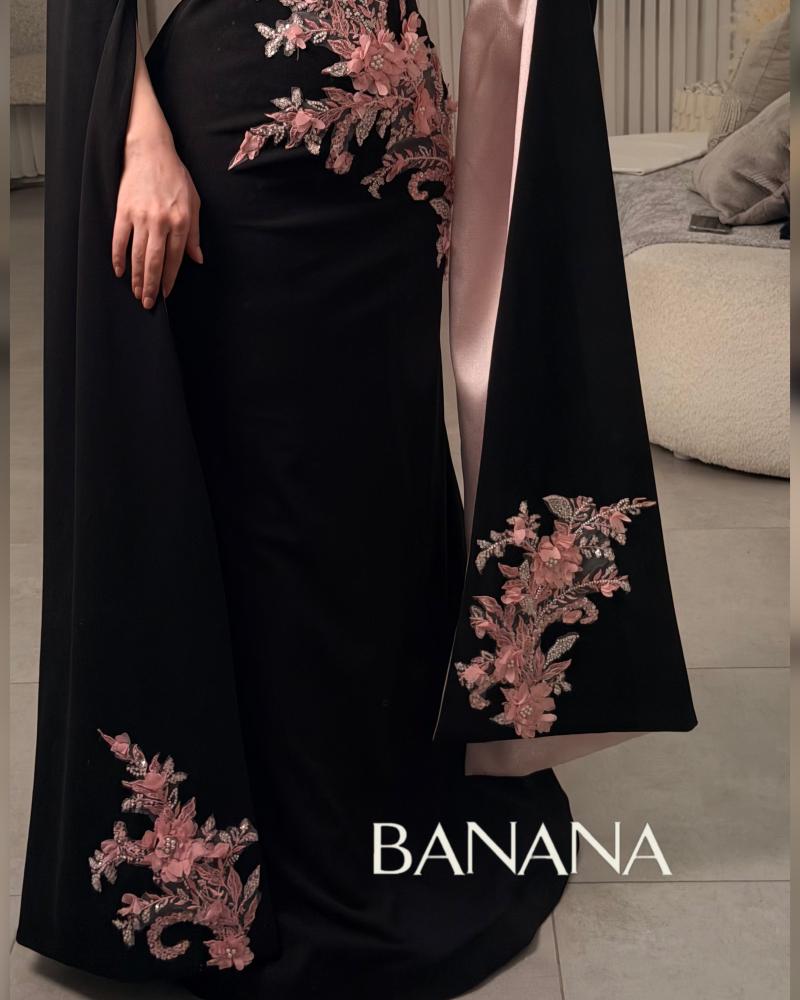 فستان سهرة هدب أسود مطعم بالورود الوردية وبطانه التفتة الوردية